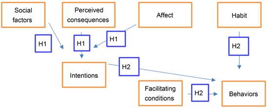 In addition, the intentions towards the behaviors can be impacted by the social factors, perceived consequences, and affect factors. Social factor means whether or not the behaviors can be agreed upon by the culture and others. This meaning is similar to the meaning of the subjective norm in the Theory of Planned Behavior. This factor is used to explain whether or not this individual is considered to be suitable to do this behavior. Perceived consequence means the value of the behaviors for the individuals. Triandis (1980) suggested that the more important perceived consequence is, the more possible the individuals will do this behavior, and the perceived consequence may either be loss or gain. The perceived consequence is the consideration based on the knowledge. By contrast, the affect factor is the internal feeling of the individuals. It explains why there are some good behaviors not being done and why some bad behaviors are being done. Some good perceived consequences may not bring good effects for the individuals. As a consequence, there may be a conflict between these two factors.