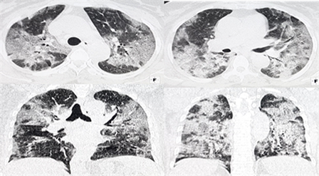 Figure 2. Axial CT scan images and coronal reconstructions withparenchymal window showing areas in frosted glass with “crazy paving”.