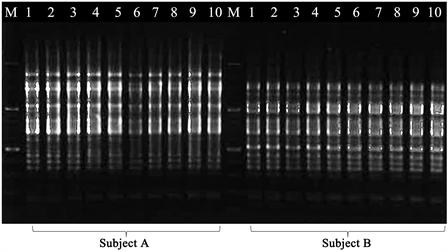 Figure 1. Genetic differences among C. albicans isolates from subject A and B with AP-PCR. Left lanes: 1 - 10,C. albicans isolates from subject A; right lanes: 1-10, C. albicans isolates from subject B; M, molecular size marker (100-bp DNA ladder).