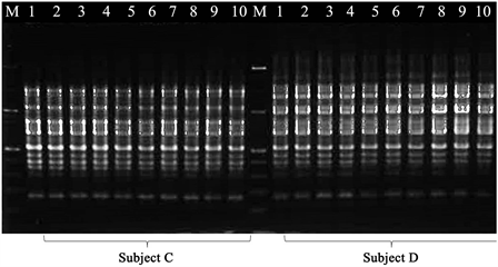 Figure 2. Genetic differences amongC. albicans isolates from subject C and D with AP-PCR. Left lanes: 1 - 10, C. albicans isolates from subject C; right lanes 1-10, C. albicans isolates from subject D; M, molecular size marker (100-bp DNA ladder).