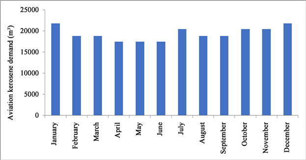 In this work, the average value (464,386.4 m3) of consumption per QAV between 2009 and 2018 will be used as a consumption reference for Brasília. To formulate aviation kerosene C (QAV-C), alternative aviation kerosene (QAV alternative) must be added to aviation kerosene (QAV-1) in the proportion of a maximum of 50%, thus considering the maximum replacement percentage, the requested quantity of alternative QAV needed to supply the demand for QAV-C is 232,193.2 m3. The distribution of demand for QAV, indicated in Figure 2, throughout the year in Brasília was not found, so it was projected based on the domestic demand of passengers transported at Brasília International Airport throughout 2019.
