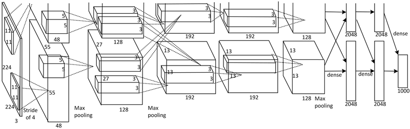 AlexNet [16] is a classic convolution neural network, and it proposes many useful concepts that have been widely applied to other deep learning algorithms. The convolution operation is the core operation of deep learning since it can find abstract and hidden features. AlexNet includes many layers that implement different operations and functions, as shown in Figure 1. Specifically, it contains the input layer, convolution layer, pool layer, full connection layer and output layer. The basic working steps can be described as follows. Firstly, the input layer processes multidimensional data. Secondly, the convolution layer calculates convolution on the input data, and then the activation function is used for nonlinear mapping. Thirdly, the pooling layer extracts valuable features to reduce parameters. Finally, the final classification results will be calculated through the softmax function.