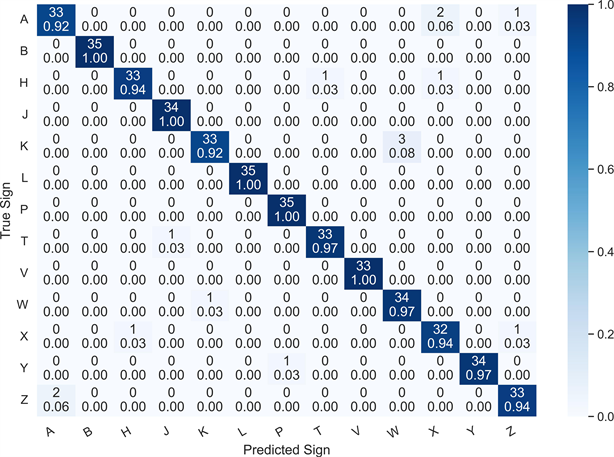 Firstly, we analyze the system performance according to the confusion matrix, as shown in Figure 5. The results show that the average authentication accuracy is 96.15 percent. We can find that all 13 user authentication is above 92 percent, and these are satisfactory accuracy. Besides, five-person authentication is 100 percent, and three persons’ accuracy is 97 percent, which shows the system has good identity accuracy.