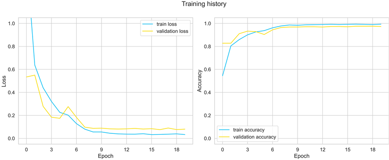 Then, we analyze the effect of epoch on the training loss and training accuracy. We can see the training loss and training accuracy keep stable after 10 epochs, as shown in Figure 6. The result shows that we just can achieve good authentication accuracy by using 10 epochs. It proves that the DenseNet can effectively finish identity authentication using motion sensors of smartphones using a little training cost.
