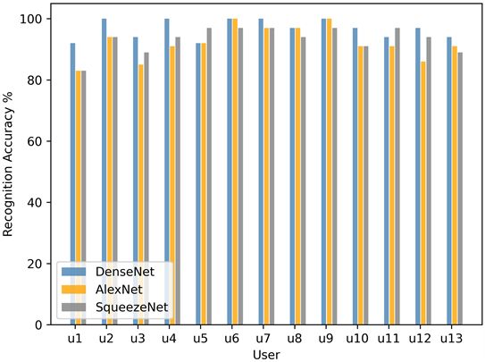 Next, we compare the performance of two neural networks, including AlexNet and SqueezeNet. The results show that the authentication accuracy decreases. The accuracy of AlexNet is 92.15 percent and the accuracy of SqueezeNet is 93.07 percent, as shown in Figure 7. This figure also proves that DenseNet holds the best recognition accuracy for all users compared with the other neural networks. The results indicate that the recognition accuracy of DenseNet is independent of users and reals satisfactory performance.