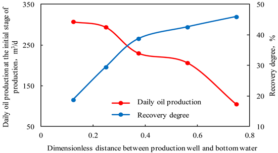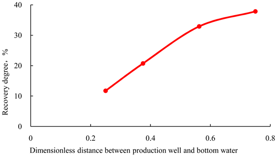 From the dimensionless distance between production wells and bottom water-recovery degree curve, the larger the dimensionless distance between production wells and bottom water, the higher the recovery degree. The water injection development law and recovery degree of different production well locations are similar to that of depletion development. When the production well is close to the bottom water, the faster the water content rises, the earlier the production well is shut in, the lower the recovery degree, and the poor production effect. As shown in Table 3 oil saturation field diagram of the production well at the bottom of the structure, the farther the production well is from the bottom water, the slower the water invasion rate, the longer the production time, the better the formation crude oil production effect, and the better the production effect, The higher the recovery degree is.