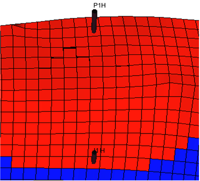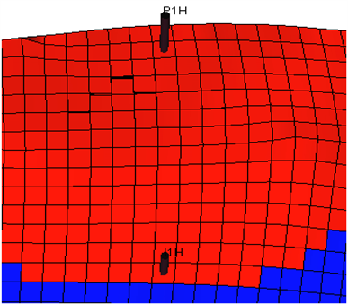 production ratio, studies the development impact of different injection production ratio, and determines a reasonable injection production ratio. The water injection well layout adopts the edge water injection method on the oil-water interface. The production well layout is at the high part of the structure, as shown in Figure 6. Set different injection production ratios, the liquid production rate of the production well is 300 m3/d, set different injection production ratios as 0.8, 1, 1.2, and shut in when the water content of the production well is more than 98% or the oil production is less than 5 m3/d.