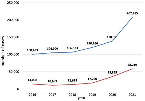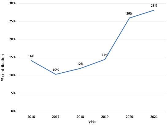 Figure 2 shows the trend of total annual case notification in numbers and the numbers notified by PPM between 2016 and 2021. Both have been on upward trend since 2017 (Figure 3).