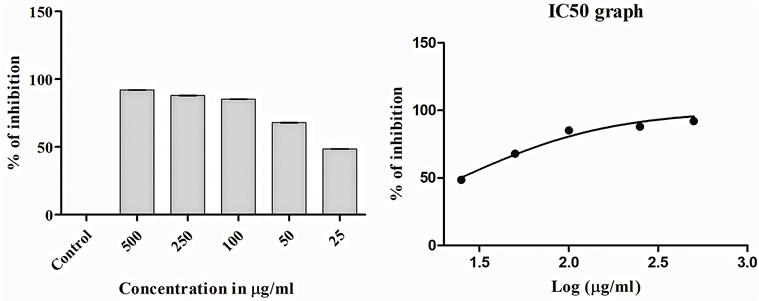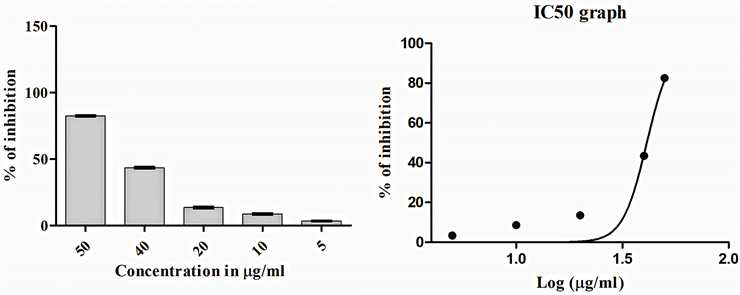 From Table 1 % inhibition of free radicals by ascorbic acid at various concentrations (5, 10, 20, 40 and 50 µg/ml) can be determined. Ascorbic acid is taken as the positive control for the DPPH assay of scavenging free radicals. From the IC50 graph (Figure 4), the value 41.21% ± 1.56% µg/ml for IC50 is obtained. Ascorbic acid at various concentrations (5, 10, 20, 40 and 50 µg/ml) showed an inhibition percentage of 3.35%, 8.64%, 13.52%, 43.45% and 82.54% respectively. Two graphs were plotted between the concentration of the sample and log values for the concentration of the sample and % inhibition as shown in Figure 4. The