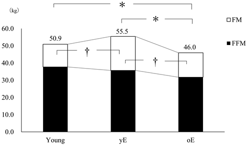 Figure 1. Body weight and distribution of FFM and FM among age groups. Young (n = 45, 19 - 22 years), yE (n = 14, 65 - 74 years), oE (n = 16, ≥75 years); FFM: Fat-free mass, FM: Fat mass; *indicates p < 0.01 by Tukey’s test (oE vs Young, oE vs yE in FFM). †indicates p < 0.01 by Tukey’s test (yE vs Young, oE vs yE in FM).