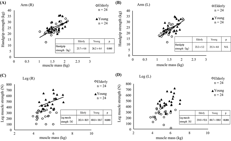 In order to investigate the correlation between muscle mass and strength, measurements of muscle mass and strength were performed on the same day. The muscle strength measurements involved handgrip and leg muscle strength. The participants who consented to both the muscle mass and strength measurements were included (elderly subjects: n = 24; young subjects: n = 24).