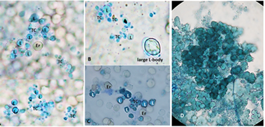 Figure 1. Formation of L-forms and development of L-form population in broth during cultivation of blood from patient with endometrial cancer. (A, B) spherical L-bodies of different size (L), around them aggregates of thrombocytes (TC); (C) spherical L-bodies, around them erythrocytes (Er); (D) culture of propagated spherical L-bodies. Native preparation from broth, contrasted with methylene blue. Magnification 1000×.