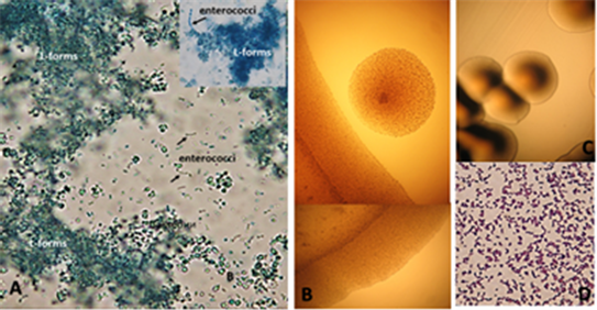 Figure 2. Conversion of L-forms into classical bacteria ((A) arrows) in broth and isolation of Enterococcus faecalis from blood of patient with endometrial cancer. (B) typical L-form growth and “fried egg” shaped colony on semisolid agar; (C) typical colonies of Enterococcus faecalis; Gram stained smear from colonies. Native preparation, contrasted with methylene blue (A). Magnification: A, D: 1000×; B: 200×.