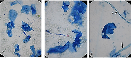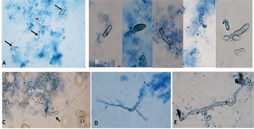 Figure 3. Observation of fungal elements from the life cycle of filamentous fungi in SDB from blood of patients with endometrial cancer. Irregular protoplastic L-bodies ((A) arrows); (B) Fungal cells (conidia); (C) Germinating and tube-producing conidia (arrow); (D, E) formation of septate hyphae. After subsequent sub-cultivation on solid media (SDA), typical growth of Aspergillusfumigatus was found. Magnification: 1000×.