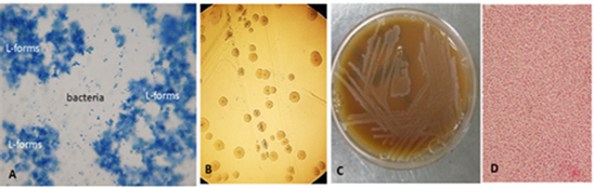 Figure 6. Conversion of L-forms into classical bacteria in broth (A) and isolation of Enterobactercloacae from blood of patient with acute myeloid leukemia. (B) Typical for L-forms tiny “fried egg” shaped colonies on semisolid agar; (C) Typical colonies of Enterobactercloacae; (D) Gram stained smear from colonies. Native preparation, contrasted with methylene blue (A). Magnification: A, D: 1000×; B: 200×.