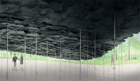 environment. Instead, he sought the balance between artificial structure and the existing nature. Ishigami also celebrated his philosophy of “free architecture” in the historical park of London. Although the roof was made by stone, Ishigami avoids the traditional roofs with angular corners. He arranged a cluster of scattered rock that seemed to protrude from the ground of the surrounding park. In the concept map, the gradually smooth lines of the slate and the corrugated carvings on the slate free the material from the rigid stereotype. The space under the eaves also maintains freeness, without any barrier to the outside nature. On the one hand, the pavilion blurred the boundary between the building and the environment by echoing the environment (See Figure 24). On the other hand, the architect reflected it to his own design philosophy through innovative design elements to give building its own volume in the environment.