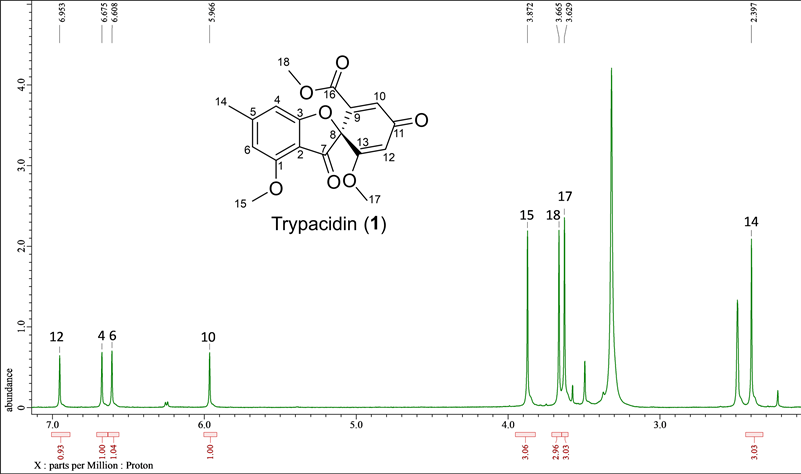 obtain 1 (2.4 mg) as a white amorphous powder. The structure of 1 was determined as (-)-trypacidin ([α] D = −68.1, c = 0.05, MeOH) by comparison of MS and NMR spectral data and optical rotation in reference to previous data [11], [15] and detailed analyses of 2D-NMR data in DMSO-d6 (Table 1 and Supple. Figures S1-S7).