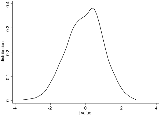 In order to further enhance the robustness of the test results, verify that reducing the sharing degree of knowledge networks is the main reason for specialized and special new enterprises to improve innovation performance, and confirm that there are no other variables related to the sharing degree of knowledge networks but cannot be observed to affect the innovation performance of enterprises. Refer to the practices of Pan Yue et al. (2017), Xu Nianxing and Li Zhe (2016), the degree centrality of the knowledge network sharing degree in that year was randomly assigned to each specialized and special new A-share listed company, and the knowledge network sharing degree and enterprise innovation performance in random order were regressed 500 times according to model 1. The regression results of Placebo test using the degree of knowledge network sharing as the proxy variable of knowledge network sharing degree are shown in Figure 2 and Table 7.