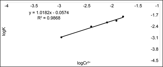 where K is the initial rate of the reaction, C is the molar concentration of Cr3+, n is the order of the reaction, and k' is the apparent rate constant. The linear regression equation is: LogK = 1.0182x − 0.0574 with R2 = 0.9868, the slope value which is n is 1.0182 (≈1) therefore confirming that the order of the reaction is the first one. The experimental K values were utilized to plot the linear curve; logK vs logC as shown in Figure 12. The data analysis was carried out with a 95% level of confidence; the standard errors of the slope and intercept are 0.0648 and 0.1535, respectively [19] [20].