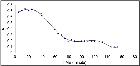 Three prepared solutions which of Cr3+, ninhydrin and KOH which have the following concentration respectively 6.24 × 10−3 M, 2.4 × 10−3 M and of 8.9 × 10−3 M are mixed with together at room temperature with final volume of 50 mL to investigate the effect of time of reaction on the absorbance of the colored product. The intervals time were 5, 10, 15, ··· until 155 minutes. The absorbance of the product was measured every 5.0 minutes over the 155 minutes. All of the experiments were repeated and the average result was taken.