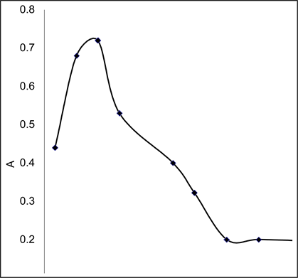 Figure 8. Effect of KOH concentration on the absorbance of the colored product. Conditions: Cr3+ = 6.24 × 10−3 M, Ninhydrin = 2.4 × 10−3 M, total volume 50 ml at room temperature, λ = 375 and the contact time = 15 minutes.