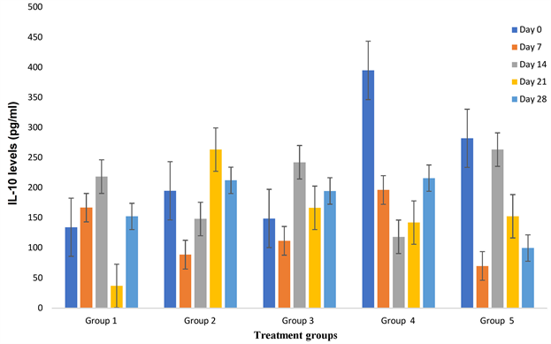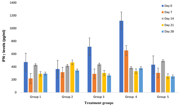The trend as seen in Group 1 reveals an undulating trend as IFN γ levels decreased (P < 0.05) from Day 0 to Day 7 in all treatment groups (1 - 5), increased from day 7 to day 14 (Groups 1, 2, 3 and 5), decreased from Day 14 to 21 (Groups 1, 3, 4 and 5) and an increase from day 21 to day 28 (Groups 1, 4 and 5). Figure 1 also reveals high baseline values of IFNγ for Group 3 (713.3 pg/ml) and Group 4 (1119 pg/ml). Group 4 had the highest (P < 0.05) value compared to other treatment groups. Put together, the results suggest IFNγ levels reduced significantly (P < 0.05) from Day 0 to Day7 across all the groups.