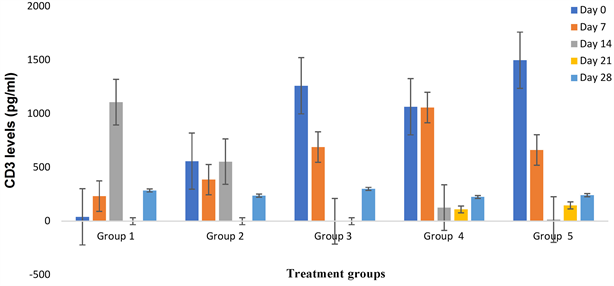 The trend in Figure 3 reveals that the baseline values for CD3 in Group 3 (1259.8 pg/ml), Group 4 (1065 pg/ml) and Group 5 (1248.5 pg/ml) were comparably higher (P < 0.01) than those of other treatment groups. A decline (P < 0.01) in CD3 levels was seen from day 0 to 7 in groups 2, 3, 4 and 5 until Day 14 .CD3 levels in groups 2 and 3 remained undetectable from days 14 to 21. All groups showed recovery from day 21. Group 1 showed an opposite trend to all the other groups till day 21.