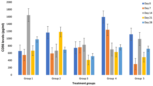 Trend seen showed a marked drop (P < 0.01) in CD56 levels from day 0 to 7 in all treatment groups. This was successively followed by an increase in cytokine levels (P < 0.01) in groups 1, 2, 3 and 4 from days 7 to 14. Days 14 - 21 was characterized by a decline in CD56 levels while days 21 to 28 was seen in groups 1, 3, 4 and 5.