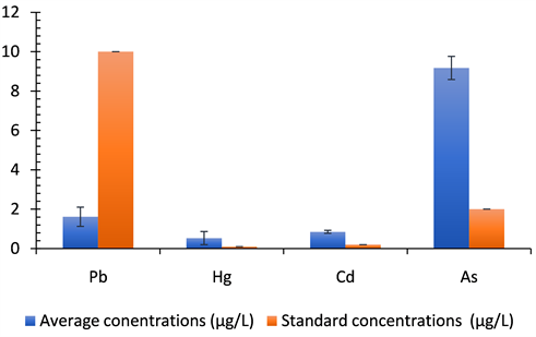 Comparing these average contents with the standards in use, it appears clearly through Figure 3 that except lead, the average concentrations of TMEs in the pond water are all superior to threshold values [19]. The content in arsenic (As) is about four times superior to norm. In fact, the histogram (Figure 3), reveals that the average concentration in lead (1.6142 μg/L), remains low compared to the requirements fixed to 10 μg/L. This result conforms to that Diop and collaborators [20], obtained in Dakar in 2014 that evaluating the contamination and the speciation of trace metals in a river containing fish alife, obtained that the average lead (Pb) oscillated between 0.047 and 3.87 µg/L. This result shows that the samples taken would not present any risk of infection or lead contamination in relation to the standard set. On the other hand, the levels of mercury (0.529 μg/L), cadmium (0.847 μg/L) and arsenic (9.174 μg/L) obtained are respectively higher than the reference values set (0.1 μg/L; 0.2 μg/L; 2 μg/L). These results are worrying insofar as cadmium poisoning could cause cancer effects in exposed individuals and lead to endocrine and/or immune system dysfunction in children [21]. Mercury and arsenic are also known to be acutely toxic at low doses, causing infections of the cardiovascular system and other serious illnesses in humans who are exposed indirectly through the consumption of fish in which these contaminants accumulate [22] [23].