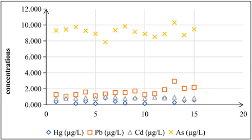 Figure 4 presents through the cloud of points the concentration levels of the metallic trace elements studied (Pb, Hg, Cd, As) in each of the fifteen (15) samples. The decreasing order of average concentration of the molecules studied are as follows: [As] > [Pb] > [Cd] > [Hg]. Arsenic is the composite that presents the highest contents with a maximum concentration reaching 9.497 µg/L. Anyway, there is agreat difference between the concentration level of arsenic and that of the three (3) other metals studied, as shown in Figure 4. This preponderance of arsenic in the water could be due not only to the regular use of fertilisers, herbicides or insecticides in the surrounding plantations, but also to the dust heaps or leaching and drainage water from the sand extraction activity carried out near the ponds. Arsenic accumulates naturally in magmatic and sedimentary rocks [24], and sand is usually produced by the weathering and erosion of rocks.