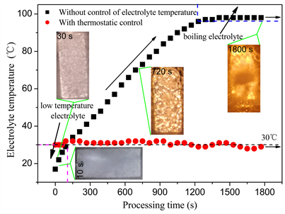 The cooling system consumes a lot of energy to suppress the increasing electrolyte temperature during traditional MAO treatment. There is another MAO treatment without control of the electrolyte temperature, which means that the electrolyte temperature will keep increasing with the development of MAO exothermal reaction. However, the MAO process without control of the electrolyte temperature has not been demonstrated and reported in publication.