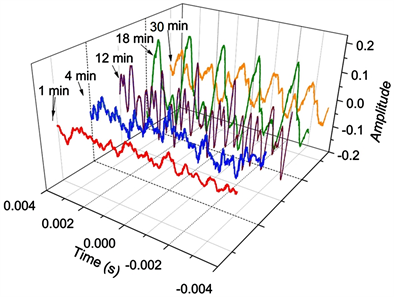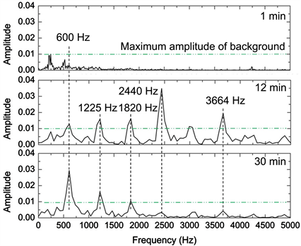 An interesting phenomenon is that the noise variation of the micro-arc discharge without electrolyte cooling was different compared with that in conventional micro-arc discharge in the electrolyte with constant temperature. Generally, the noise is getting stronger and stronger due the growing discharge voltage applied to the workpiece under the constant-current control mode of power supply. In this case, the noise gradually grew up before the electrolyte boiling, which was similar with traditional MAO process. However, the noise intensity became small when the electrolyte was boiling as shown in the image at 1800 s in Figure 3. The acoustic signals at different time were detected by the sound transducer and oscilloscope and depicted in time domain as shown in Figure 3(a). The amplitude of the acoustic signal had the maximum value at 18 min. In order to analyze the frequency characteristics of the MAO noise, Fast Fourier transform was used to transform the acoustic signals from time domain to frequency domain in Figure 3(b). The characteristic frequencies of the MAO noise were related to the frequency of the pulse voltage applied to the substrate (600 Hz in this case). At the beginning stage of 1-min treatment time, a very low peak at the characteristic frequency of 600 Hz appeared and its amplitude was lower than that of background noise mainly come from the fans in power supply. In intermediate stage at 12 min, there were several characteristic frequencies of 600 Hz, 1225 Hz, 1820 Hz, 2440 Hz and 3664 Hz at 12 min. The peak with the maximum amplitude occurred at 2440 Hz. When the electrode is boiling (30 min), the characteristic frequencies of discharge noise were almost the same as the intermediate state. But the peak with the maximum amplitude of characteristic frequency was located at 600 Hz, which was similar with the beginning state.