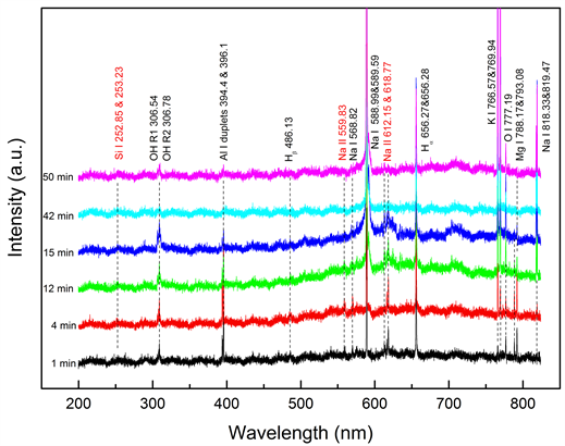 [12]. The intensity-decreasing of Al I and Mg I lines in the spectra indicates that less and less elements of Al and Mg were involved in the oxidation reaction, which was normally unfavorable to the growth of MAO barriers layer. The presence of the OES continuous spectra in the present was similar with traditional MAO process [13]. It seems that the electrolyte without cooling during MAO has little influence on the composition of the active plasma species. But the discharge at the beginning (e.g. at 1 min) is similar spectra with the discharge in boiling electrolyte (e.g. at 50 min) except for the differences in intensity, which means that the most salient lines in spectrum belongs to sodium.