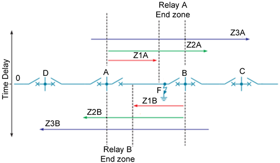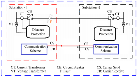 OHTL has an impedance per kilometer related to its design and construction which will be a function of OHTL length. The distance protection function looks at load current and the grid voltage, that use these values for impedance calculation related to Ohm’s law. Conventional time-stepped distance protection is illustrated in Figure 3. The delayed second zones can be accelerated by confirming the fault into the protected zones depending on the communication scheme as shown in Figure 4 [11].