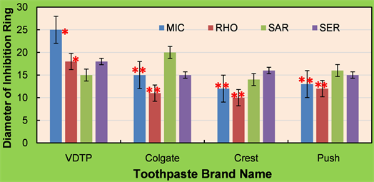 Figure 5. The mean pH of VDTP was statistically more significant than that of Push brand toothpaste (n = 4). The pH with one asterisk was significantly different from that with two asterisks (P < 0.05).