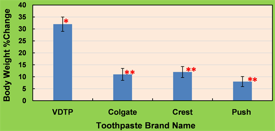 Figure 10. The body weight %change measured 30 minutes after the skin coating with toothpaste. The weight %change with one asterisk significantly differed from that with two asterisks (P < 0.05).