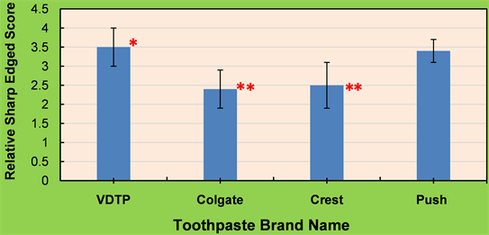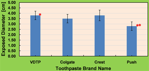 consumers desire to maintain their teeth without unsightly stains and potentially harmful bacterial plaque. Though multiple methods of estimating cleanliness are published [32], the degree of cleaning ability should be mutually supportive to some degree. While evaluating the cleaning ability because the egg was dyed only on the surface in red food coloring pigment, it had a limitation in determining the cleaning ability of each toothpaste with a clear-cut assessment. If the food coloring material was changed from red to blue or black, it might be easier to measure the cleaning ability. However, there was definite differentiation that some lineation of the exposed area by the force of brushing on the dyed egg was scientifically reasonable. In this study, as seen in Figure 7, the cleaning ability examined by the light of exposed areas shows that our formulation VDTP was comparable to that of Colgate and Crest and significantly greater than that of the Push brand.