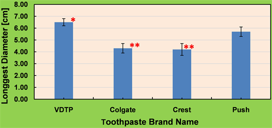 Many types of toothpaste are designed to enhance the medical and hygienic effects using the foaming ability. Further, toothpaste could produce a pleasant feeling in the mouth during toothbrushing. Foam formation plays a vital role in these sensations. Investigating the foamability and consistency of the foam is a meaningful procedure in the formulation of toothpaste. Figure 6 presents that the mean foam height of VDTP was only significantly greater than that of Push brand, while no statistical difference in foaming ability was observed from that of Colgate and Crest.