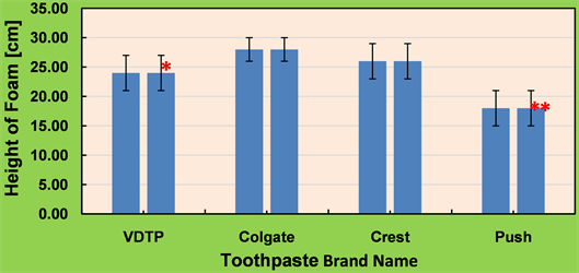 Figure 6. The mean foam height of VDTP was only significantly greater than that of the Push brand (n = 4). The foam height with one asterisk was substantially different from that with two asterisks (P < 0.05).