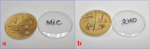 Four strains of bacterial tube cultures were used. The strains were identified by the Gram-stain method, which is used as the first step in identifying a bacterium. The pigmented bacteria strains were Micrococcus luteus (yellow) as MIC, Rhodococcus rhodochrous (pink) as RHO, Sarcina aurantiaca (orange-yellow) as SAR, and Serratia marcescens D1 (red) as SER for experimental labeling. Four Petri dishes were labeled into 4 sections 1, 2, 3, and 4. Using the inoculation wire ring, the bacteria were inoculated into the Petri dishes that were already coated with nutrient agar. And the stock solutions of 4 different kinds of toothpaste were soaked on the circular paper disk. Subsequently, Place the disk with the applied toothpaste on four sections labeled, 1—VDTP, 2—Colgate, 3—Crest, and 4—Push toothpaste, as seen in Figure 1. The bacterial culture was cultured in an Heratum Incubator (Thermo Scientific, Waltham, MA) for 48 hours.