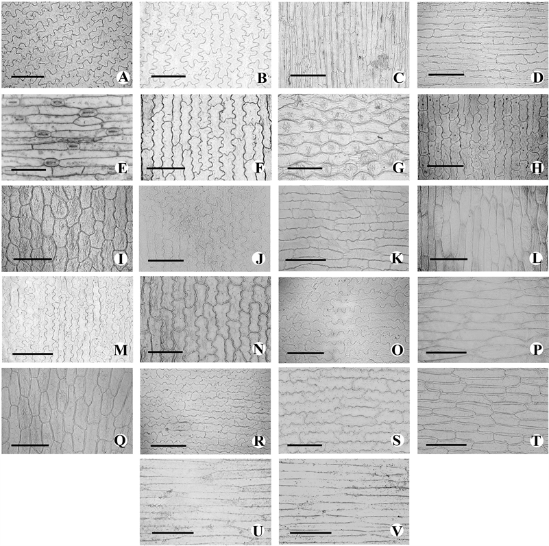 Figure 1. Micromorphological characteristics of the adaxial leaf surfaces. (A) Cardiocrinum cathayanum; (B) C. giganteum var. yunnanense; (C) Fritillaria anhuiensis; (D) F. crassicaulis; (E) F. tortifolia; (F) Lilium apertum; (G) L. bakerianum var. delavayi; (H) L. brownii; (I) L. duchartrei; (J) L. leucanthum; (K) L. meleagrinum; (L) L. nanum; (M) L. pardanthinum; (N) L. primulinum var. burmanicum; (O) L. primulinum var. ochraceum; (P) L. sealyi; (Q) L. sulphureum; (R) L. taliense; (S) L. tsingtauense; (T) L. wenshanense; (U) Notholirion bulbuliferum; (V) N. campanulatum. Scale bars = 100 μm.