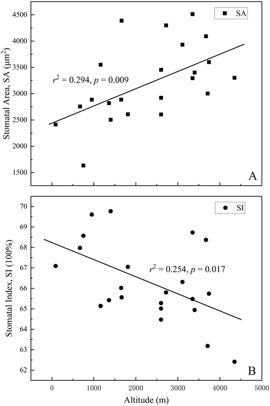 SI tended to decrease with increasing elevation. SI was inversely related to the altitude (r2 = −0.254, p = 0.017, Figure 3(B)), indicating that increases in altitude were generally accompanied by decreasing stomatal number.