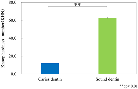 Dental caries and periodontal disease constitute the two major diseases in dentistry. Dental caries is frequently diagnosed and treated in routine dental practice. Minimal intervention (MI) is crucial during the treatment of dental caries to ensure that only the carious dentin is removed [1]. Based on in vitro histological experiments using an optical microscope, Sano et al. [2] reported that the Knoop hardness number (KHN) is less than 20 in regions infected by bacteria in active carious lesions. The guidelines from the Japanese Society of Conservative Dentistry [3] for the treatment of dental caries stipulate that carious dentin with a KHN of less than 20 should be removed.