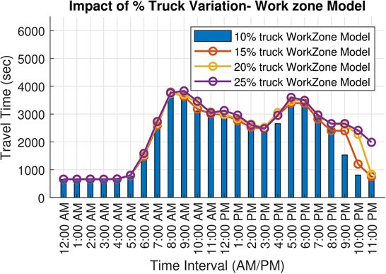 during peak hours with travel times doubling when the percentage of trucks reaches 25%. Inspection of Figure 11 indicates that due to the deterioration of conditions and system brake down in the presence of work zone there is not much difference directly attributed to truck % increase. However, for lower truck percentages, the system is expected to recover somewhat faster, as confirmed by Figure 10.