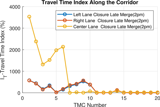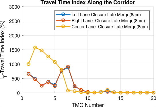 Figure 5 shows the travel time index (IT) for left, center, and right lane closure at 8 am peak traffic hour for vehicles traveling northbound along the I-65 study corridor. It can be observed that the operational performance of the corridor (expressed in terms of IT)under the left and right lane closure assumption is pretty similar. However, the IT values for center lane closure are significantly higher upstream of the work zone location where vehicles are trying to find a