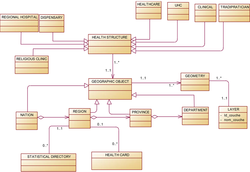 The general architecture of a health system can be found in our model (Figure 3) through a hierarchical declination of geographical objects and health structures.