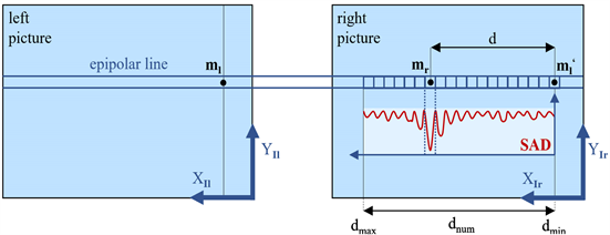 The SAD is calculated for all possible disparity values d and thus for all pixels of the search-space. To identify the most similar point, the algorithm subsequently determines the minimum of the SAD curve. In the described manner, the procedure successively examines all pixels of the stereo image pair and determines their disparity. The resulting disparity maps are enhanced by post-pro- cessing steps before output.