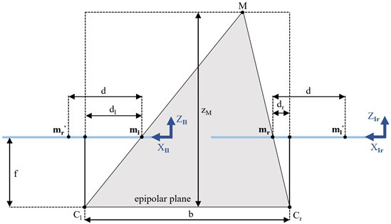 This property significantly simplifies the algorithmic search for point correspondence, since instead of examining the entire image planes, only the corresponding epipolar line in both image planes needs to be examined. It also allows the definition of the term disparity as a measure of the horizontal displacement of both point correspondences relative to the two image coordinate systems (Ir) and (Il) as follows.