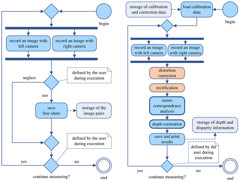Figure 8. Activity diagram for depth estimation (left) and for the calibration procedure (right).