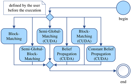 Subsequently, methods for stereo correspondence analysis search for corresponding image points or pixels in both images. For the purpose of performance comparison, several different methods are implemented. Before starting the programme, the user can select one of the methods included in OpenCV, which